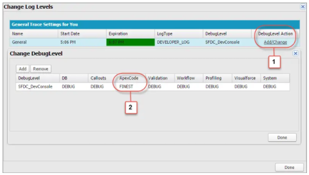 - ApexCode: Apex 코드와 관련된 이벤트를 기록하고 Apex 메서드의 시작과 끝에 대한 정보가 포함