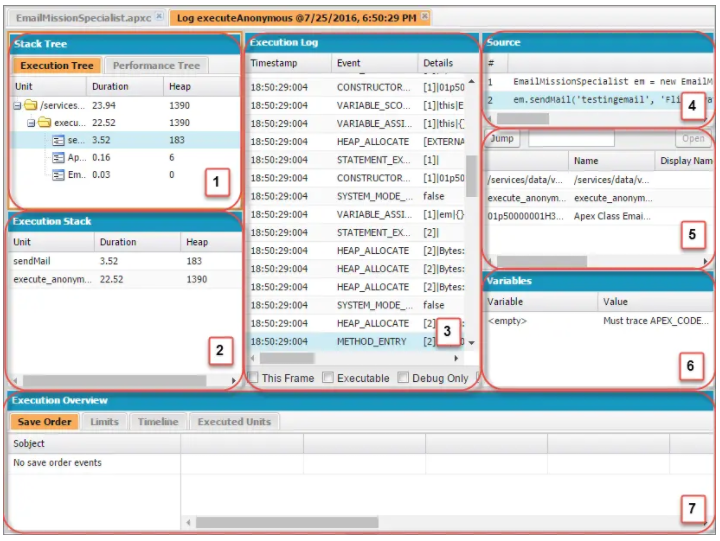 예를 들어, 잘못된 전자 메일 주소 값을 입력했을 때 생성 된 로그 항목을 선택하면 소스 목록에execute_anonymous_apex. - Variables - 선택한 로그 항목을 생성 한 코드가 실행될 때 범위에 있었던 변수와 할당 된 값을 표시.