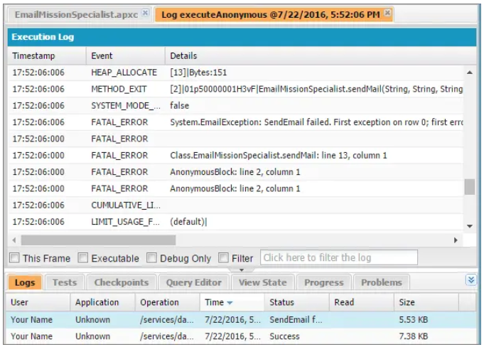 예를 들어, 생성 한 실행 로그에서치명적 오류 전자 메일 주소가 유효하지 않은 것으로 판단되면 이벤트가 기록된다. - Details - 코드가 실행 된 코드 줄과 메서드 이름에 대한 세부 정보.