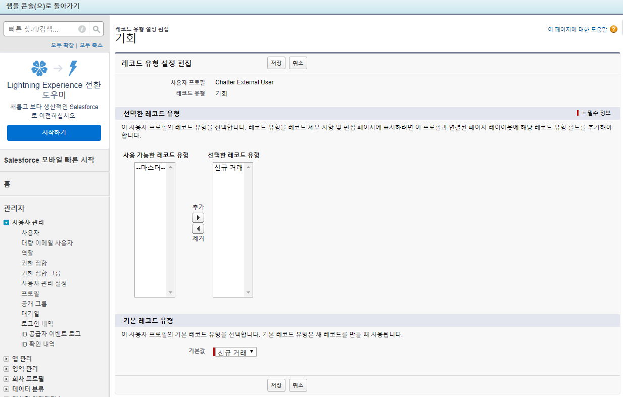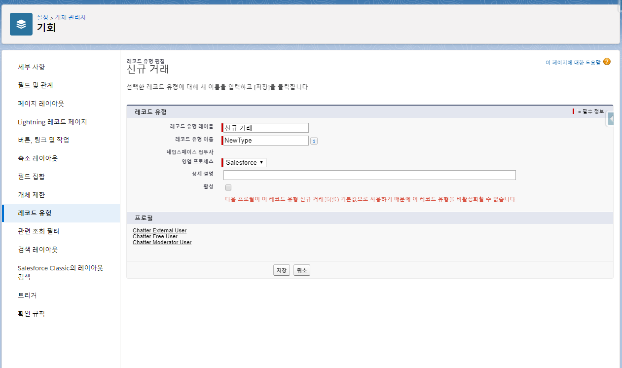 - 위 설명에서 문제된 기회 개체의 레코드 유형을 사용하고 있는 Chatter User의 프로필에 할당된 레코드 유형을 변경해보자.