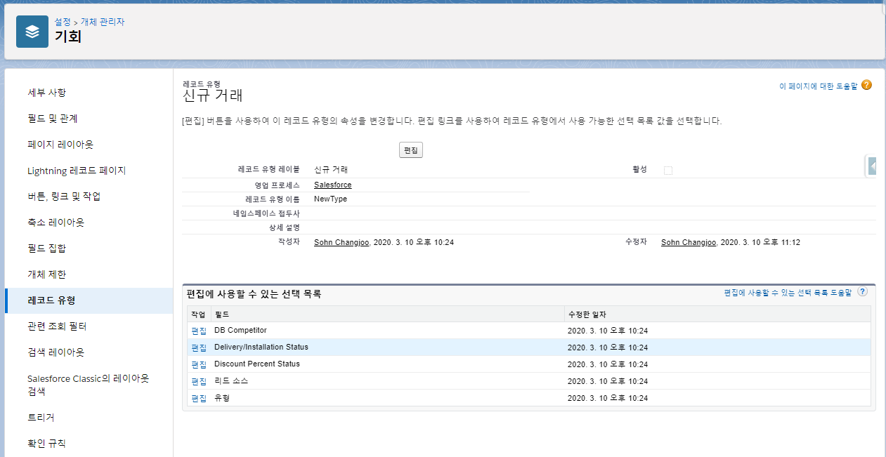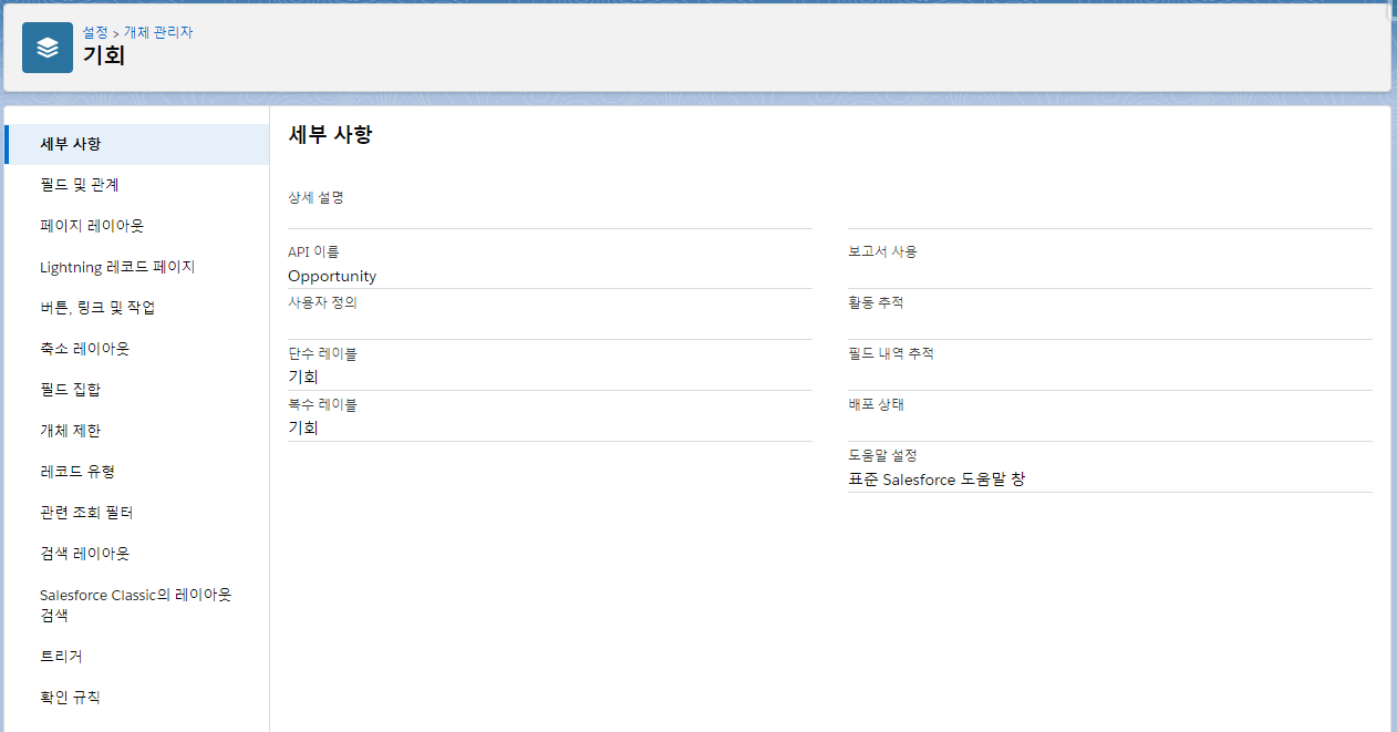 - 표준 개체인 경우, 개체의 API 이름(Opportunity)을 그대로 입력하면 된다.