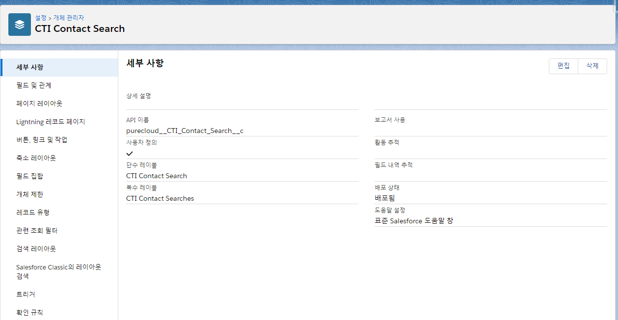 표준 개체와 마찬가지로 API 이름(purecloud__CTI_Contact_Search__c)을 입력해도 된다.