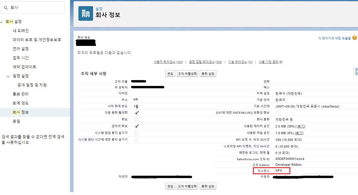 도메인을 설정한 경우, 설정>회사 설정>회사 정보 메뉴로 이동하면 인스턴스 값을 알 수 있다.