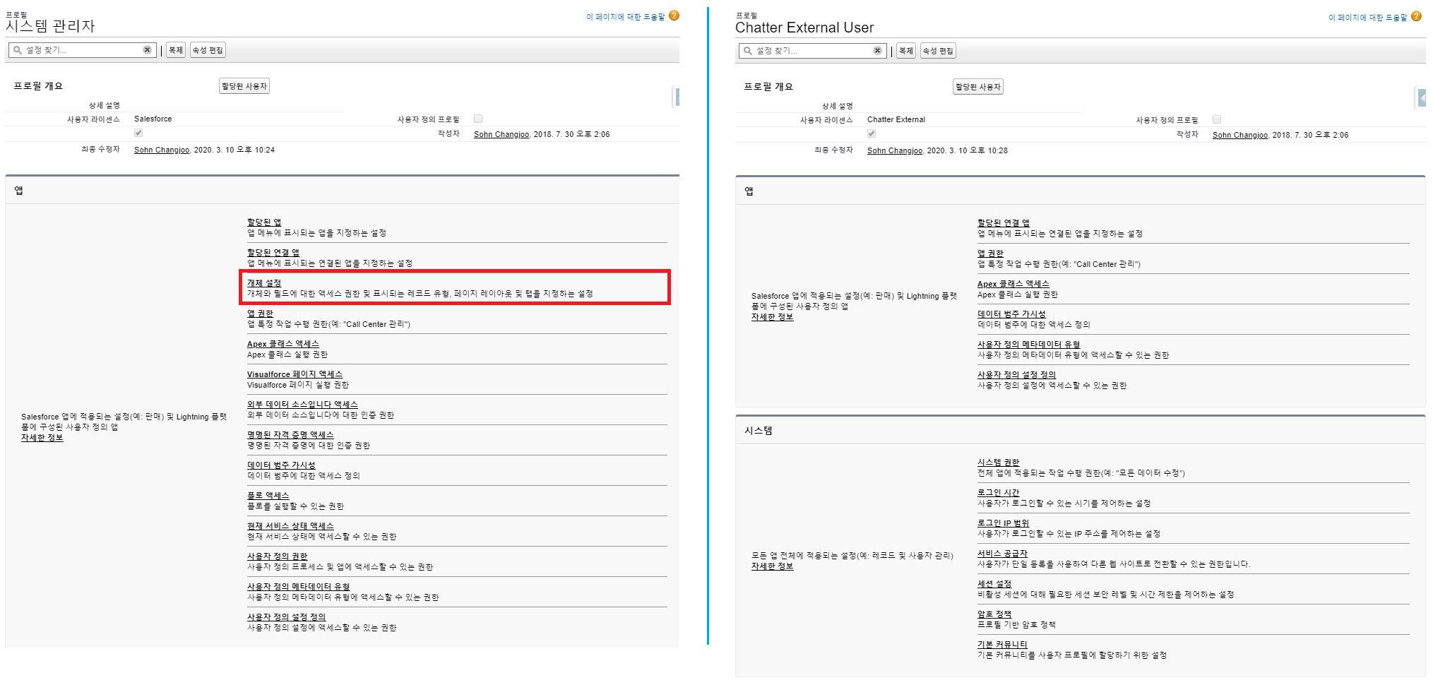 - ProfileID: 문제가 되는 프로필 링크를 각각 클릭하면 프로필 설정화면으로 바로 이동할 수 있다. 이 때, 각 3가지 ProfileID은 00e6F000002gW6W / 00e6F000002gW66 / 00e6F000002gW6V 이 된다.
